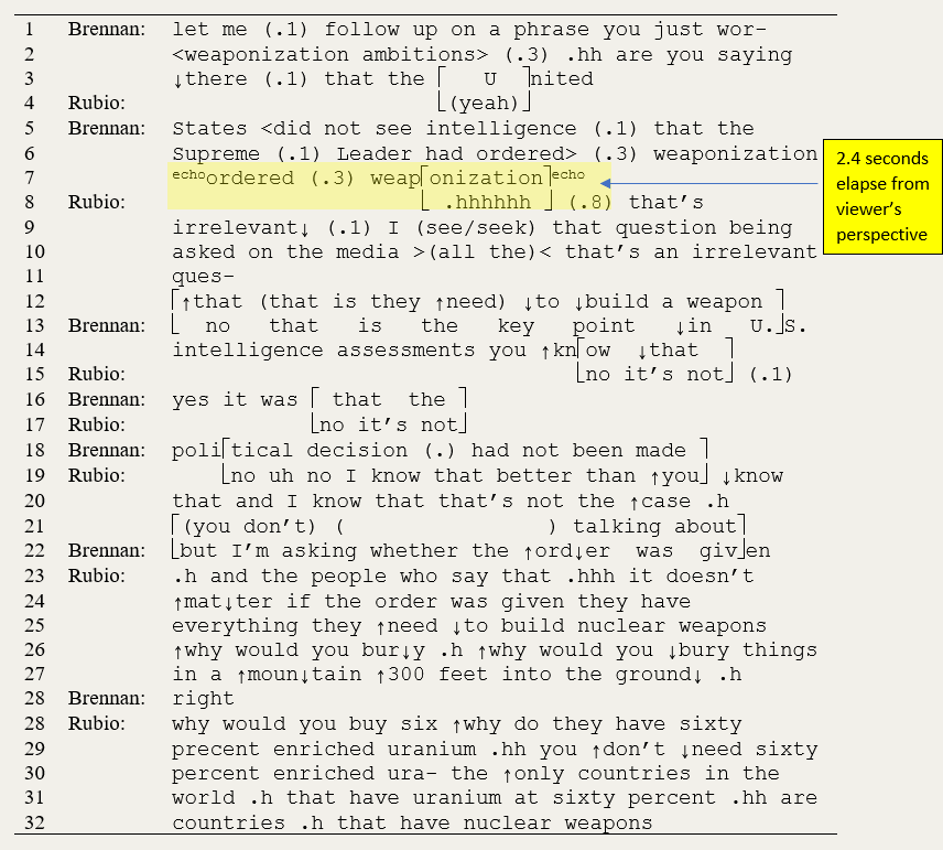 - Rubio’s “yeah” in line 4 is oddly placed. From his perspective, he probably said it right after Brennan’s reference to “weaponized ambitions.”