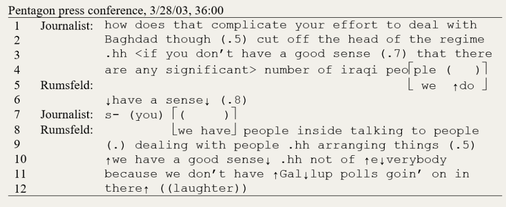 I wrote about such “opportunistic interruptions” two decades ago (Gibson 2005). That was my first foray into Supreme Court oral arguments, but the example I want to use here came from another setting, namely a Pentagon press conference. This was shortly after the start of the Iraq War. In lines 1-4, the journalist begins to ask Secretary of Defense Donald Rumsfeld a question about the U.S. strategy of (as our leaders were fond of saying) “decapitating” the Iraqi regime. Right away, this is set up as a challenging question by the expression “complicate your effort” (line 1). But the journalist does not get to explain what, exactly, complicates that before Rumsfeld interrupts in line 5. (Transcribing conventions are explained here.)