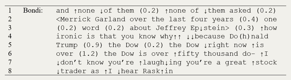 “None of them asked about Merrick Garland over the past four years one word about Jeffrey Epstein,” she begins. “None of them” is repeated (line 1), almost certainly for dramatic effect (cf. Schegloff 1987). Also contributing to this is the repeated emphasis on “none” (indicated by the pitch arrows), the slower tempo in lines 2-3 (indicated by < >), and the pauses (in parentheses). “How ironic is that?” she asks, rhetorically. “You know why?” she continues, posing a question that, in the context of a monologue, anticipates that the speaker is prepared to provide the answer.