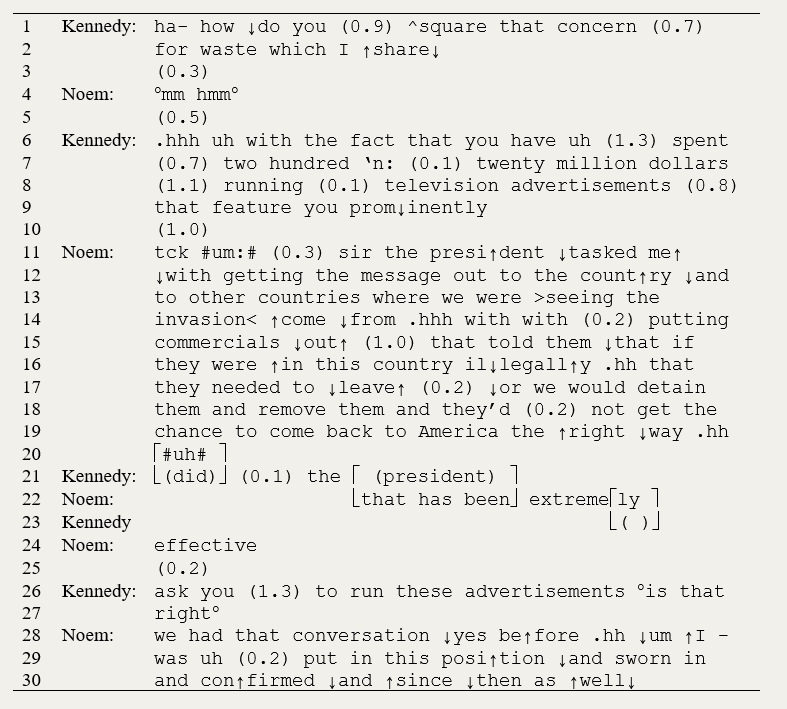 This is where the first excerpt starts; transcribing conventions are detailed here. (I recommend listening to the audio.) In lines 1-9, Kennedy asks Noem to “square” that financial stewardship with the profligate advertisements, something that she must have seen coming. Basically, she is asked to give an account, which Scott and Lyman (1968: 46) define as “a statement made by a social actor to explain unanticipated or untoward behavior,” by attempting to bridge “the gap between action and expectation.” To account for the ads, Noem appeals to a rationale that supersedes frugality, namely instructions from her boss, in pursuit of the goal of reducing the number of illegal immigrants. However, she says that she was “tasked…with putting commercials out,” but not with putting these particular commercials out.