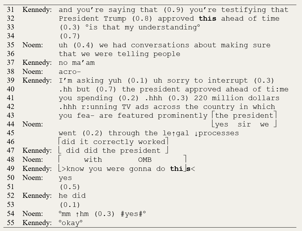 A moment later, after a brief exchange about the contracting process, Kennedy pressed her again. See the second excerpt. In lines 31-33 he offers a paraphrase of her earlier answer, acting as if it was more definite than it was. “You’re…testifying that President Trump approved this ahead of time.” After a hesitation, Noem evades again, and here (in lines 35-36) it is entirely obvious that the “conversations” she’s referring to were on the general topic of messaging, not this ad. Kennedy tries again in lines 39-43, turning the screws even further, asking if the president approved the spending of $220 million on these advertisements specifically. In line 44, Noem again appears to answer straightforwardly, only to obscure this in lines 45 by explaining her compliance with “the legal processes”—so that the “yes sir” in line 44 seems, after the fact, more like an indication that she understood the question than an answer to it. Kennedy tries yet again in lines 47 and 49. Now, however, he relies on the vague “this,” which might explain why, at long last, she answers straightforwardly, in line 50 and then again in line 54.